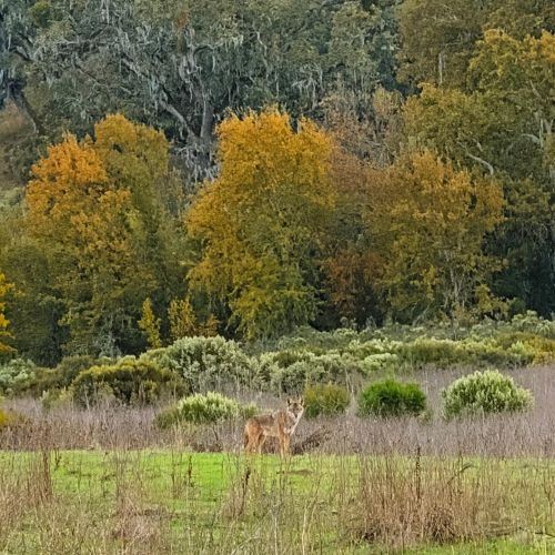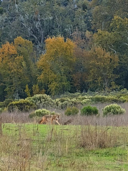 傍晚山中,暮色渐合,四无人声,声在草间。虫唱此起彼伏,向我合拢。前面草间突然窜出一只郊狼,毛厚且亮,显然已准备入秋了。据说年幼郊狼在秋天离家,开辟自己的势力范围。它也许刚刚离家不久,正在巡视新天地。它一动不动,戒备地看着我。我也停下脚步:它身后已有些树变黄了,有些常绿乔木也挂了些秋霜,深浅不一,和这只郊狼的毛色相得益彰。此刻,秋如歌般徜徉而来,层出不穷。