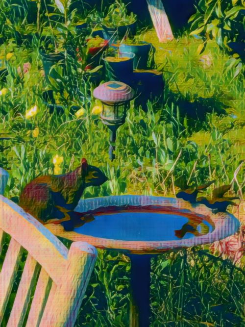 A squirrel took a chance while cat is sleeping, ran across the yard and climbed up the bird bath, sneaking in for a drink of water.