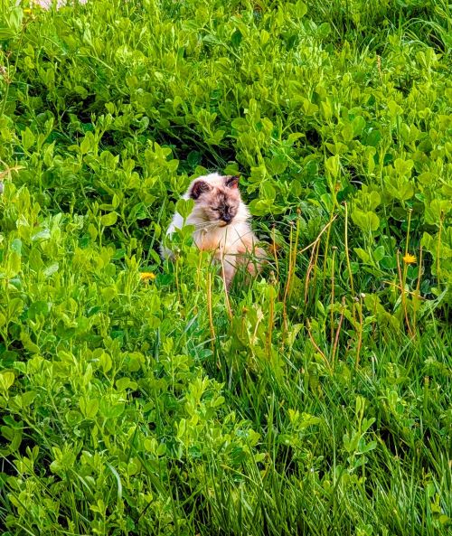 In our front yard, a feral cat whom I named “Dirty Face” buried herself in the newly grown grass, napping peacefully. It’s in-between the storms this week, and she finds herself a cozy spot to doze in. The grass was washed by the rain, getting greener; Dirty Face is whiter too, making quite a contrast yet perfect picture. Cats are such a Zen Masters, totally present; they move with ease, find ease everywhere and become the definition of ease. Never worry about the upcoming storm or next meal, here and now is all that matters.
