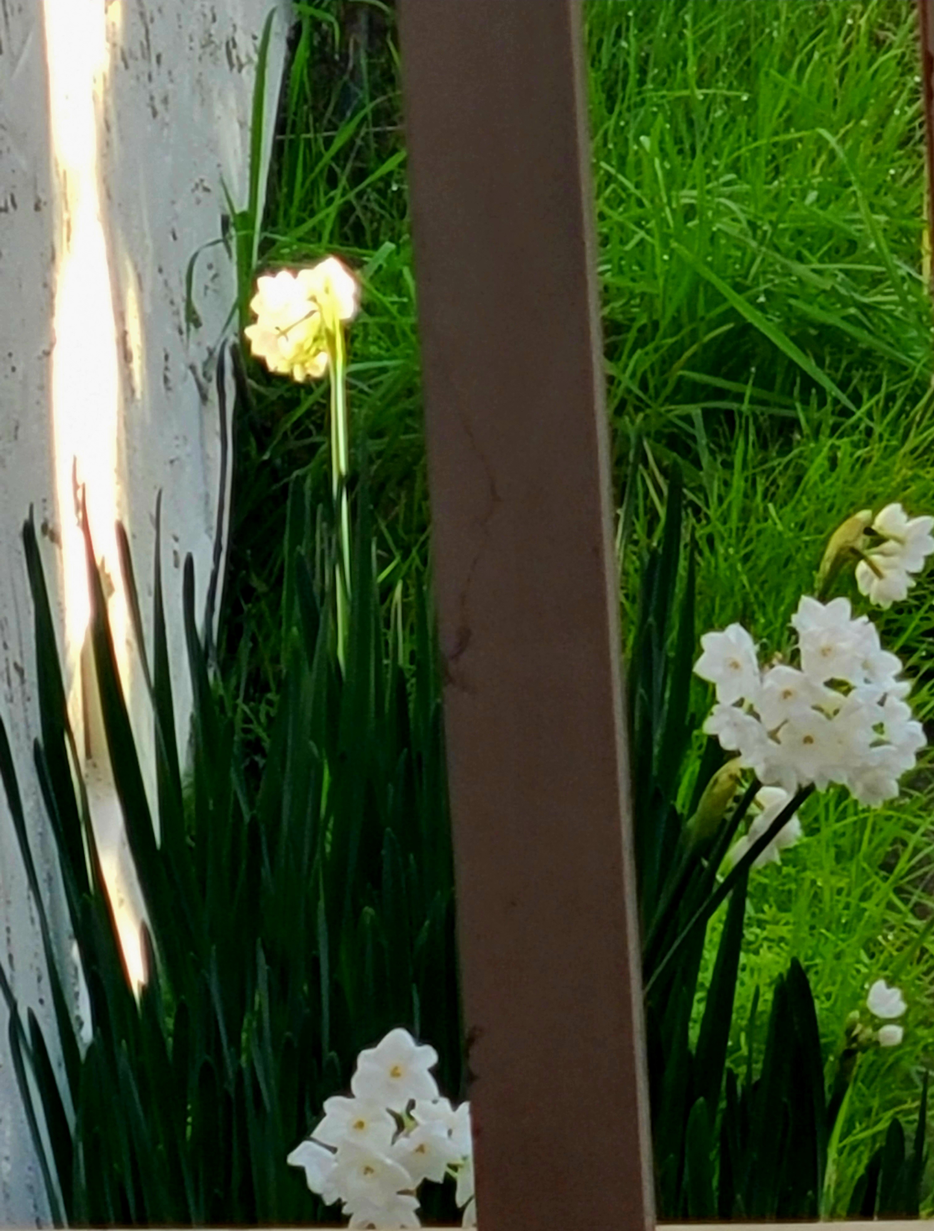I walked to the front yard, where a few narcissus are blooming in their prime. They are different from peonies, they don’t close at night. They are like guards standing on duty or elegant ballerinas, blooming and shining their glory even at night when no audience is around. No wonder Hawaii has a beauty pageant named: Narcissus. It’s truly a resilient and elegant beauty, quiet and in solitude, not noisy or gaudy, pure and self-sufficient. What a light in Winter, shining through even in the dark night.